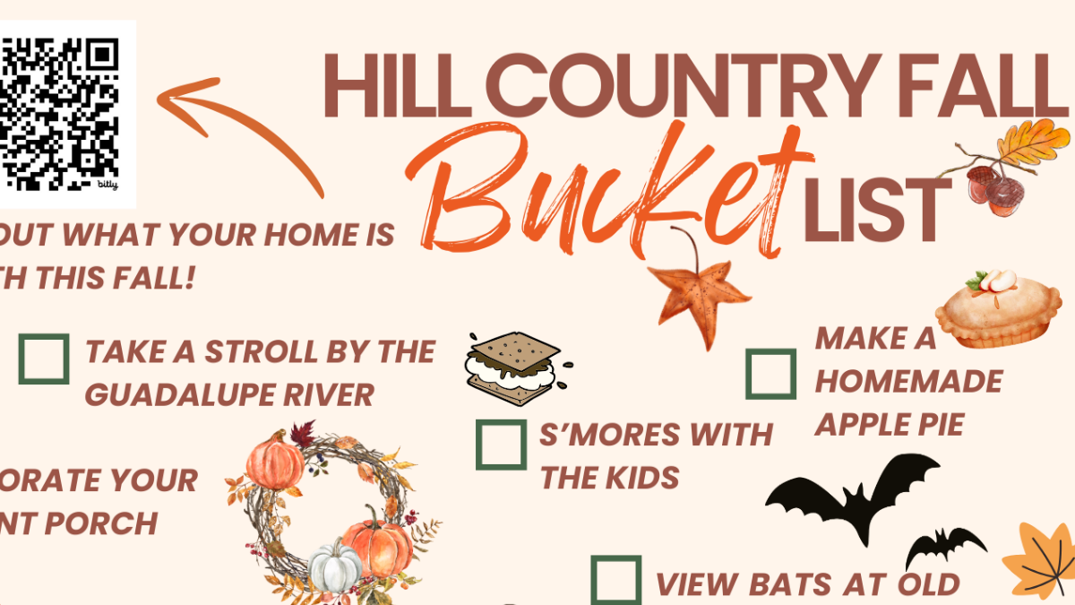 Fall is days away here in the Texas Hill Country. Are you ready to immerse yourself in pumpkins? Get a jump start to all your festive fall activities by printing this free Hill Country Fall Bucket List. Or stop by an open house this fall for a free print out.